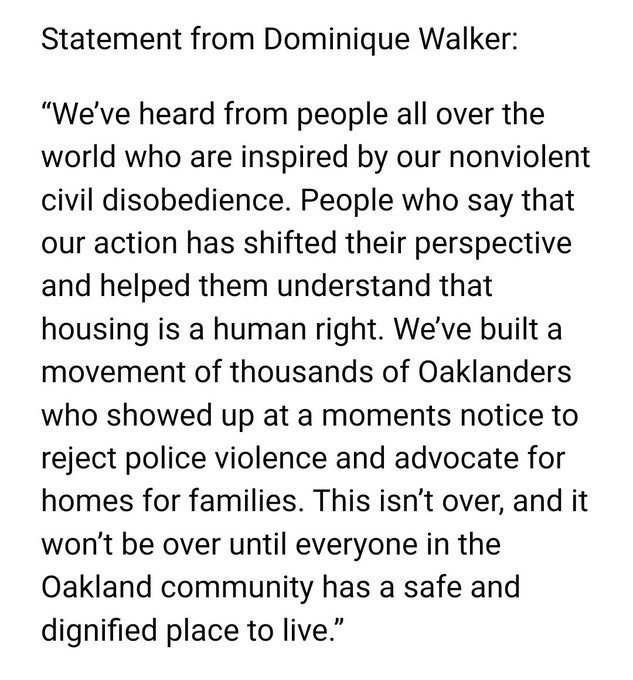 After making arrests and boarding up the now vacant home, law enforcement then piled into vans as people surrounded the vehicles and began banging on the sides while chanting. One of the mothers who had been living at the house, Dominique Walker, then gave a statement to the media. When the raid began, she had been at a nearby radio station speaking live on Democracy Now! when she received word that the raid was taking place and hurried back to the home in West Oakland.