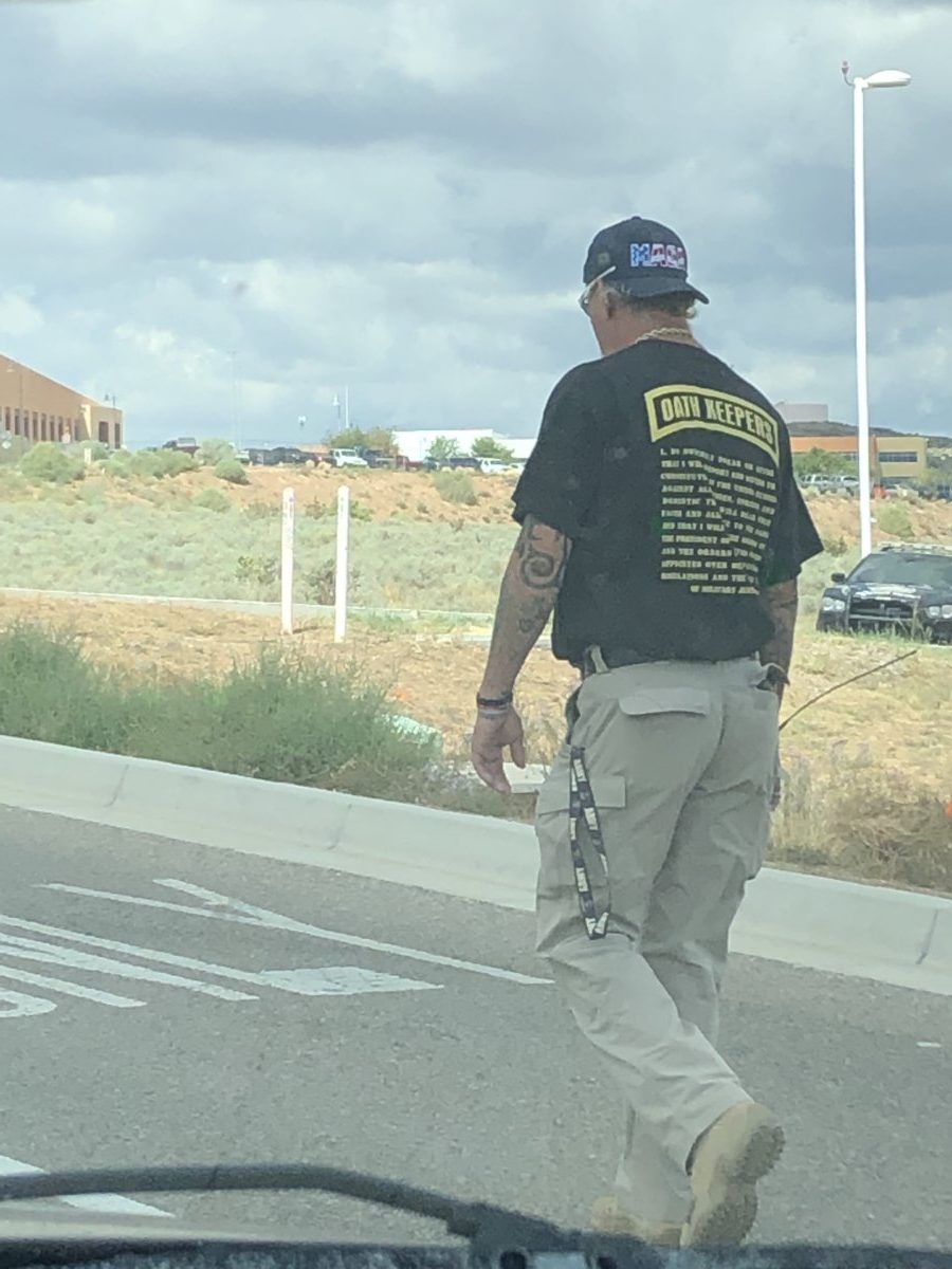 Leading up to this event, thousands of people in the Albuquerque area committed to protesting Trump’s presence in New Mexico. However, organizers immediately began receiving death threats. Those who persisted were then targeted by Secret Service and received unannounced home visits. A local organizer and activist, Javier Benavidez, live-streamed his conversation with Secret Service to Facebook. Many brave protesters hung banners from overpasses on the interstate and assembled outside the rally. They had to make their way through patrolling groups of Oath Keepers to do so and experienced harassment from Trump supporters throughout the day. The Oath Keepers were patrolling the street leading to the event, had a pop-up tent in the parking lot, and had access to all the areas that only security and police were allowed to enter. They engaged with police officers and private security throughout the day. The Trump administration is actively and knowingly using the Oath Keepers as security for these events.