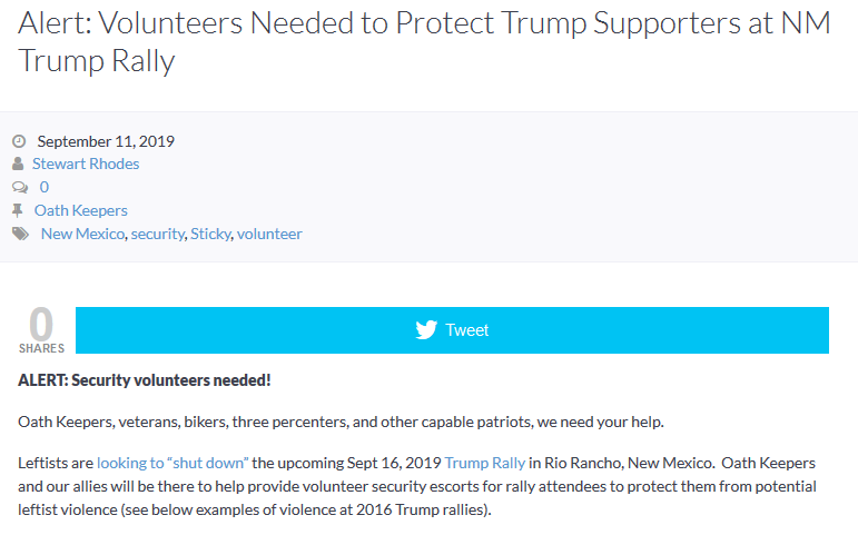On their website, Oath Keeper leader Steward Rhodes called on supporters and members of other far-Right organizations to volunteer at the rally, writing: