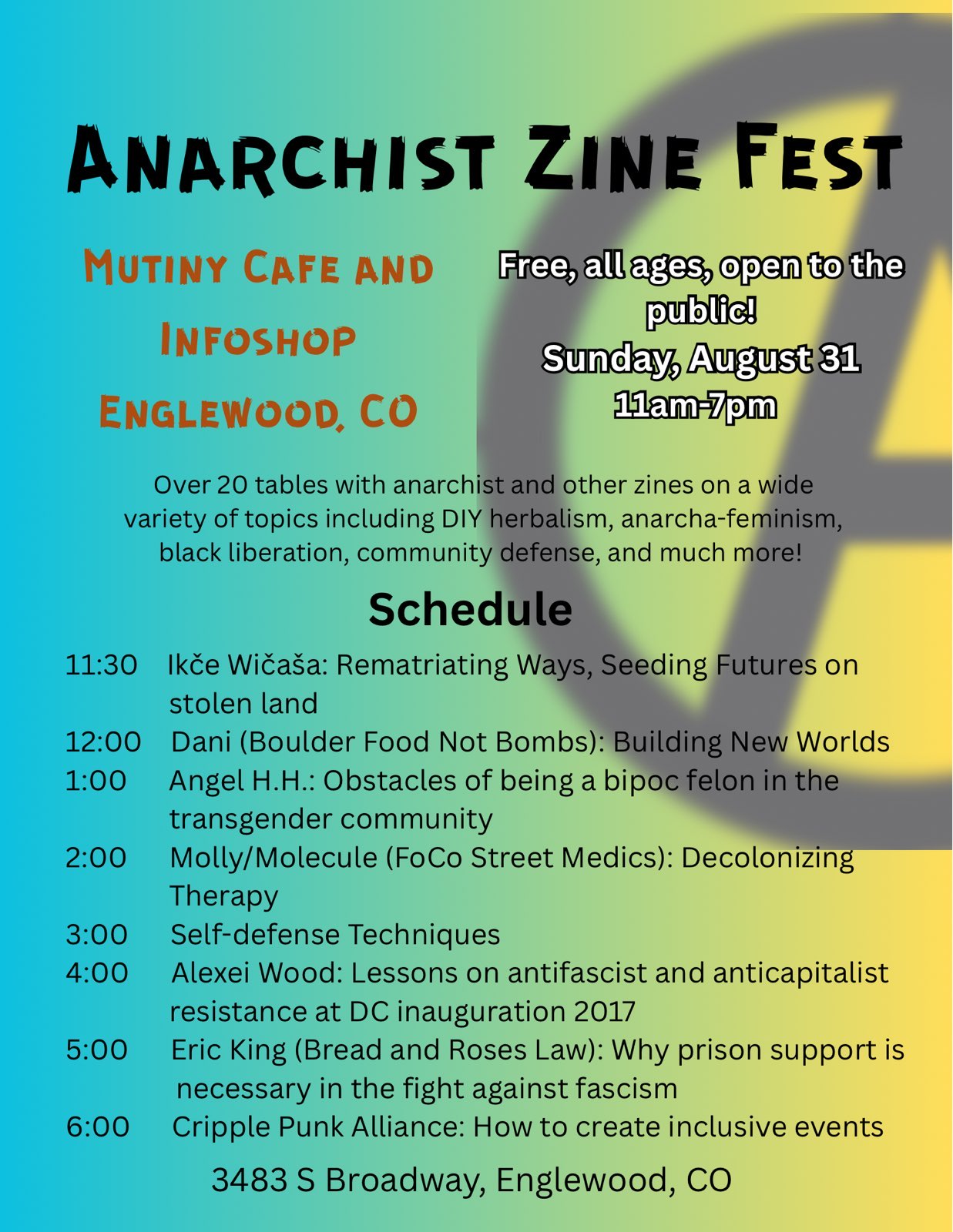 Please join us in the mile-high, sanctuary city that is aching for liberation. On this day we wish to foster conversations and activities that promote: healing, appreciation, awareness, preparedness, and relationships unique and common to all of our struggles. There will be more than 20 tables of anarchist and other zines, as well as seven workshops and talks.