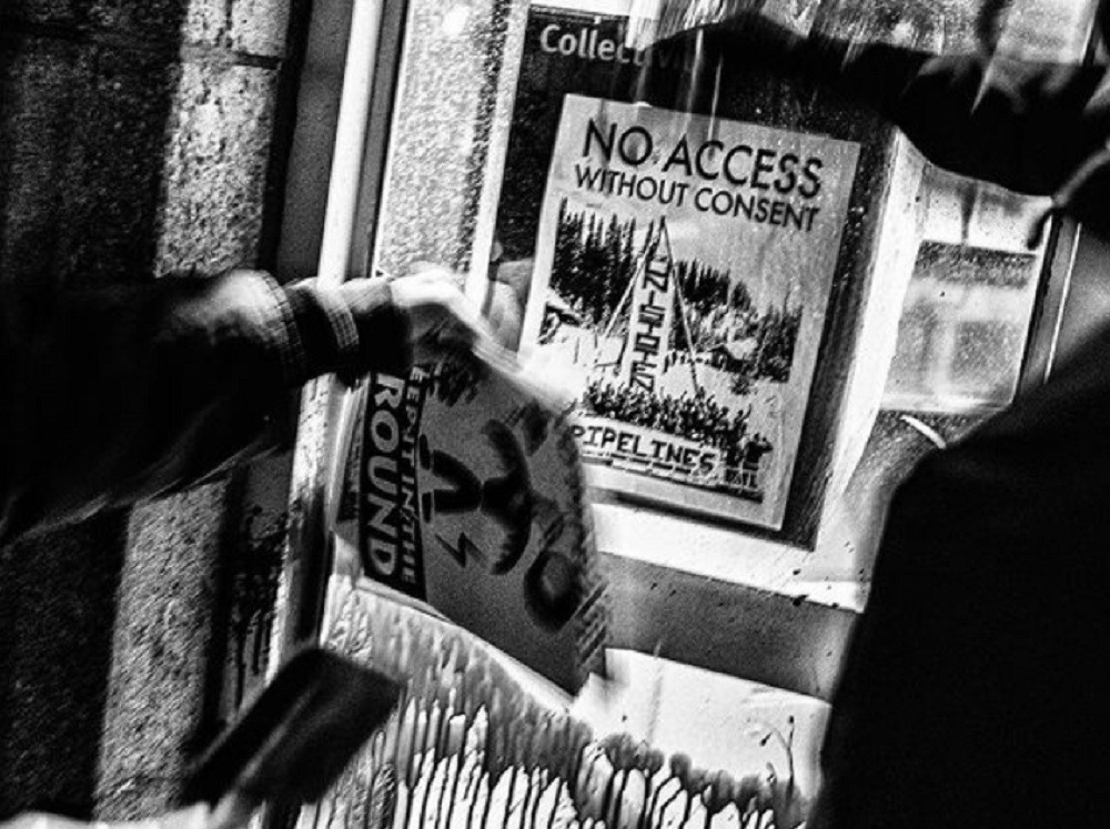 We went out last night to do a fire extinguisher paint job on the facade of the RBC branch located at the corner of Mont-Royal and Papineau in so-called “Montreal”. In the context of the call by the Gidimt’en clan for an international week of action to defund Coastal GasLink, we acted in solidarity with the Wet’suwet’en who continue to defend their Yintah and who recently re-established Coyote Camp. Our solidarity will not be interrupted by the new lockdown in progress here.