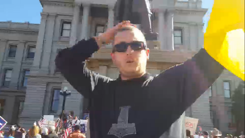 At around 10:00 a.m., antifascists who’d answered the call began to gather at Civic Center Park, squaring off a couple blocks away but in open view of the “March” 4 Chump. We continued to gain numbers over the next half hour while the cops took their time lining up in front of the Trump supporters. While we waited to confront the psuedo-march, a dipshit identified as Thomas James Simon began to antagonize our group by shoving his phone in faces and lunging towards us with his skateboard. An antifascist promptly introduced his phone to the pavement, effectively ending his career as a “street journalist”. He again tried to hit us with his skateboard, but backtracked rather quickly after getting beat with flagpoles and kneed in the head. Honestly, what did he think was going to happen? A DPD bicycle squad rolled up as we took off towards the Capitol steps to go toe-to-toe with the Trump rally, leaving the scene before they could do shit about this loser’s assbeating.