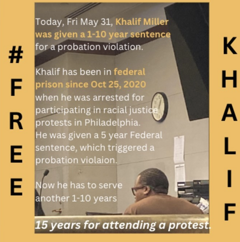 Philadelphia uprising defendant Khalif Miller has been given a 1-10 year state sentence on top of his existing 5 year federal sentence. You can write to him at: