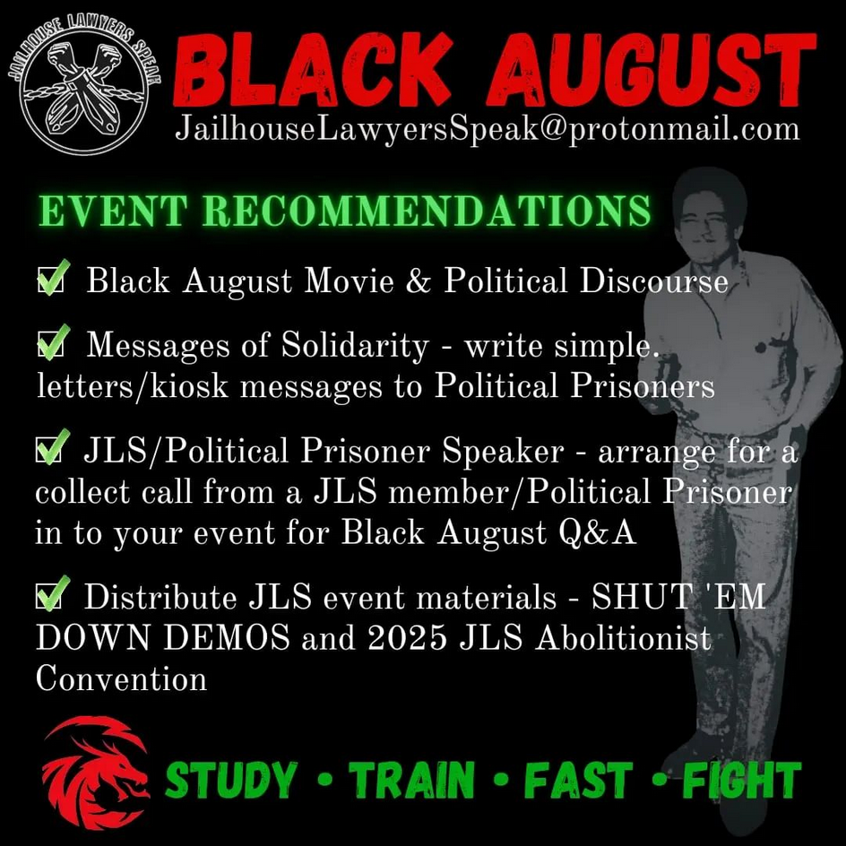 The entire month of August is commemorated as Black August, and Jailhouse Lawyers Speak have suggested a number of ways that outside supporters can help mark the occasion, as well as sharing messages from Sundiata Jawanza and James “Doc” Holliday.