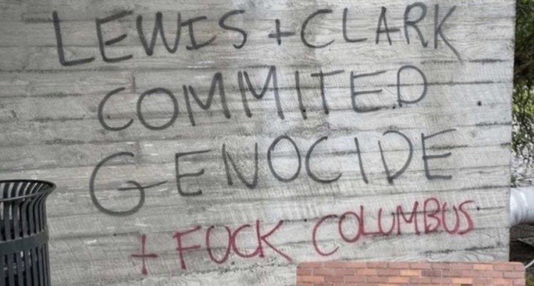 Signage at colonial institutions were not spared. In Portland, OR, Lewis & Clark College had “CHANGE NAME” not so subtly suggested. And the recently opened Tesla dealership and service station in Nambe Pueblo, NM didn’t escape the rage at the betrayal of the Pueblo’s decision to climb in bed with Elon Musk and become green capitalists.