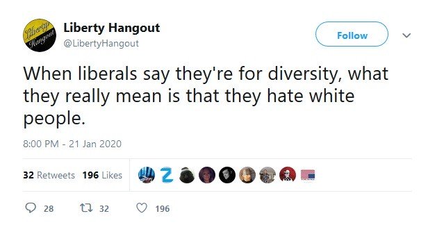 This reference to the 14 Words, in combination with their frequent anti-diversity posts, demonstrates a preoccupation with a mythological white oppression identical to that of white nationalists.