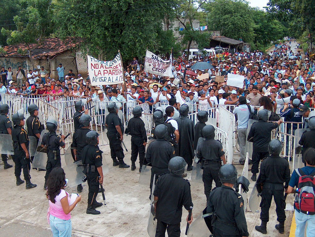 The trial by fire occurred on August 14, 2005. That day the government deployed the full force of the State with thousands of riot police to guard the assembly held in the community of El Campanario, located near San Marcos, far from the bastion of the communities in resistance. Marco Antonio and the people of CECOP made their way there as best they could. The enraged crowd overtook the police and the organizers of the assembly where they planned to authorize the expropriation and occupation of lands for the dam.
