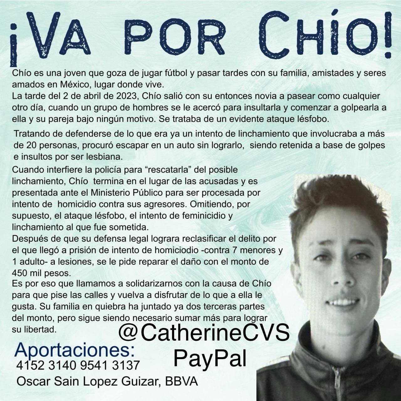 Es por eso que llamamos a solidarizarnos con la causa de Chío para que pise las calles y vuelva a disfrutar de lo que a ella le gusta. Su familia en quiebra ha juntado ya dos terceras partes del monto, pero sigue siendo necesario sumar más para lograr su libertad. Puedes enviar un donativo a través de PayPal a @CatherineCVS.
