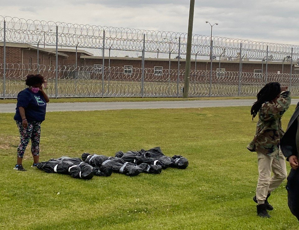 Over 20 cars and 40 people turned out from all over NC and a few cars from Virginia joined as well. Together, the procession drove past the prison a few times, with some individuals acting as pallbearers leaving “body bags” in the parking lot to symbolize and pay respects to those lives lost at the hands of NC DPS’ gross negligence and mishandling of the epidemic raging throughout their system.