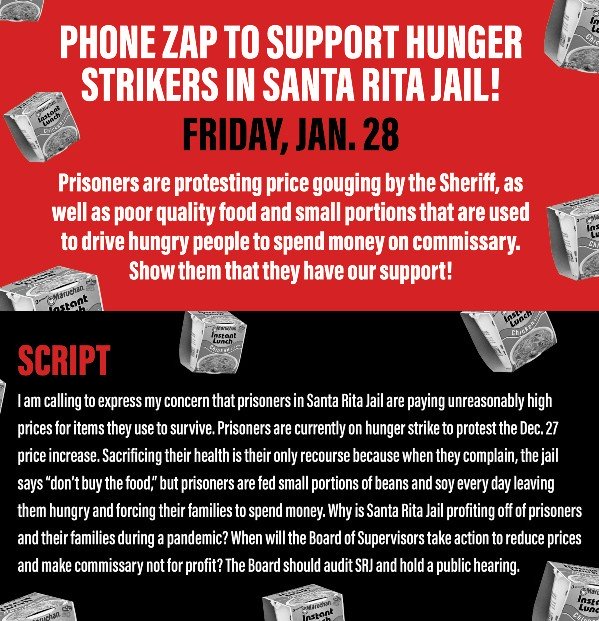 Prisoners are protesting price gouging by the Sheriff, as well as poor quality food and small portions that are used to drive hungry people to spend money on commissary. Show them that they have our support!