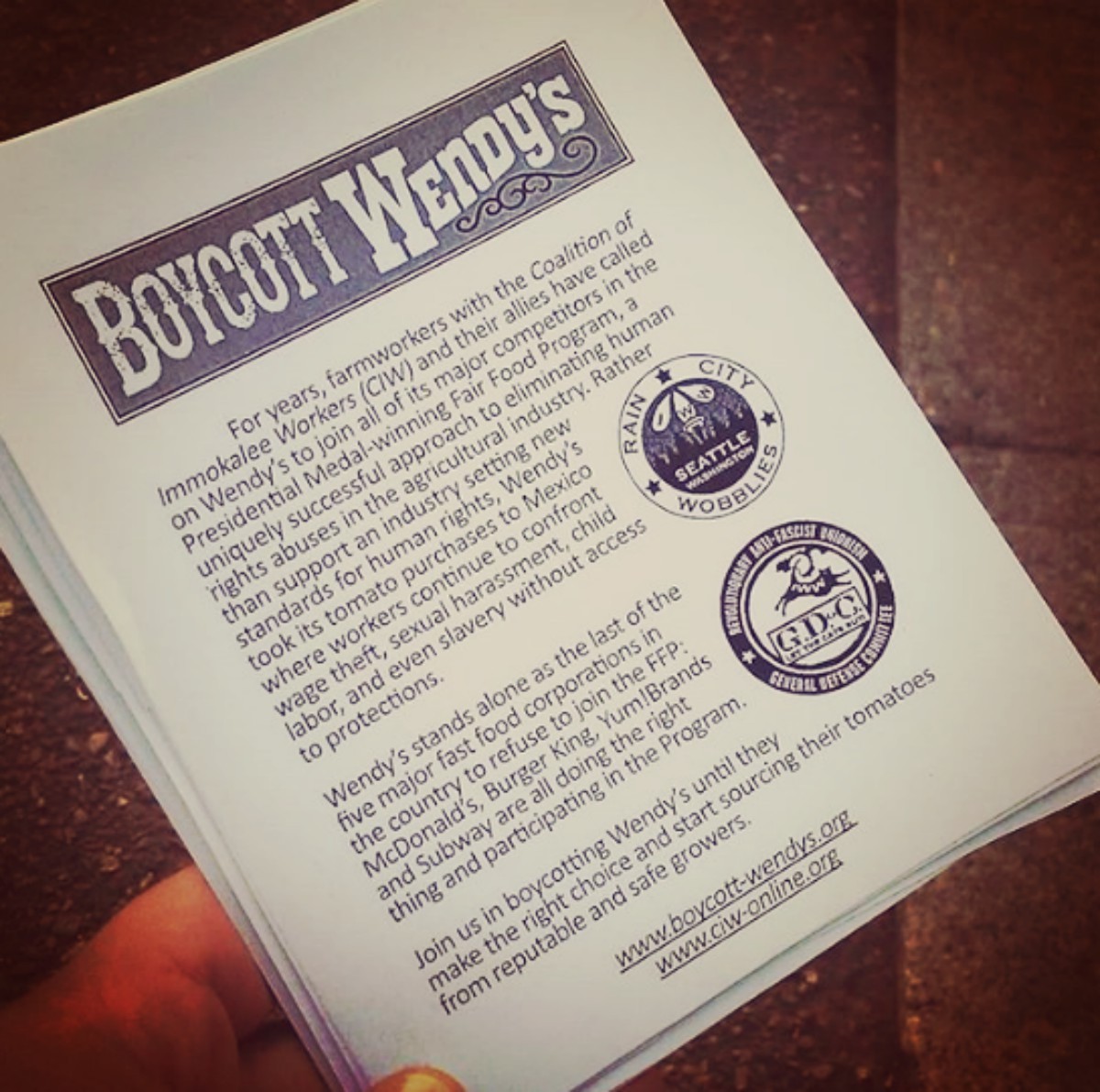 The Greater Seattle IWW General Defense Committee held a strong picket line at the Wendy’s on Rainier Avenue in South Seattle for Decentralized May Day. This action was in solidarity with the Coalition of Immokalee Workers boycott of the chain. Wendy’s is the only major fast food chain not to sign an agreement to refrain from buying tomatoes from growers with severe sexual assault and labor issues in their fields. At the same time, the Seattle IWW General Membership Branch was hosting a boycott at the Wendy’s on Lake City Way in North Seattle.