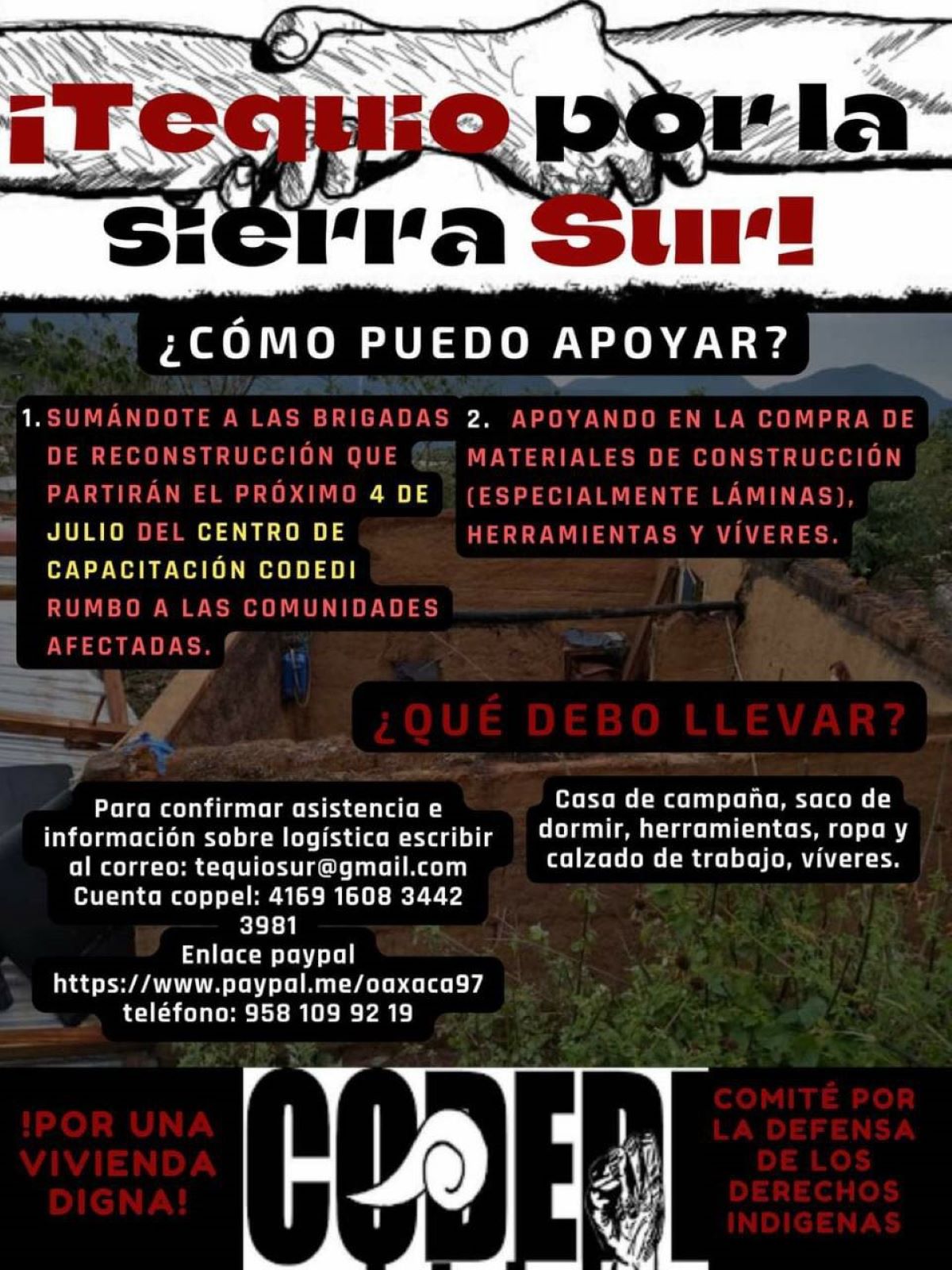 On this occasion, in the face of these new necessities, we again want to support our affected compañeros and compañeras. As such, we make an extensive and cordial invitation to civil society, to all individuals and collectives, to join this solidarity work in the different reconstruction brigades that we will begin on July 4 of this year. Our objective is to construct and repair houses for the families who have been left without homes, working with materials from the region and construction material that we can acquire through donations.