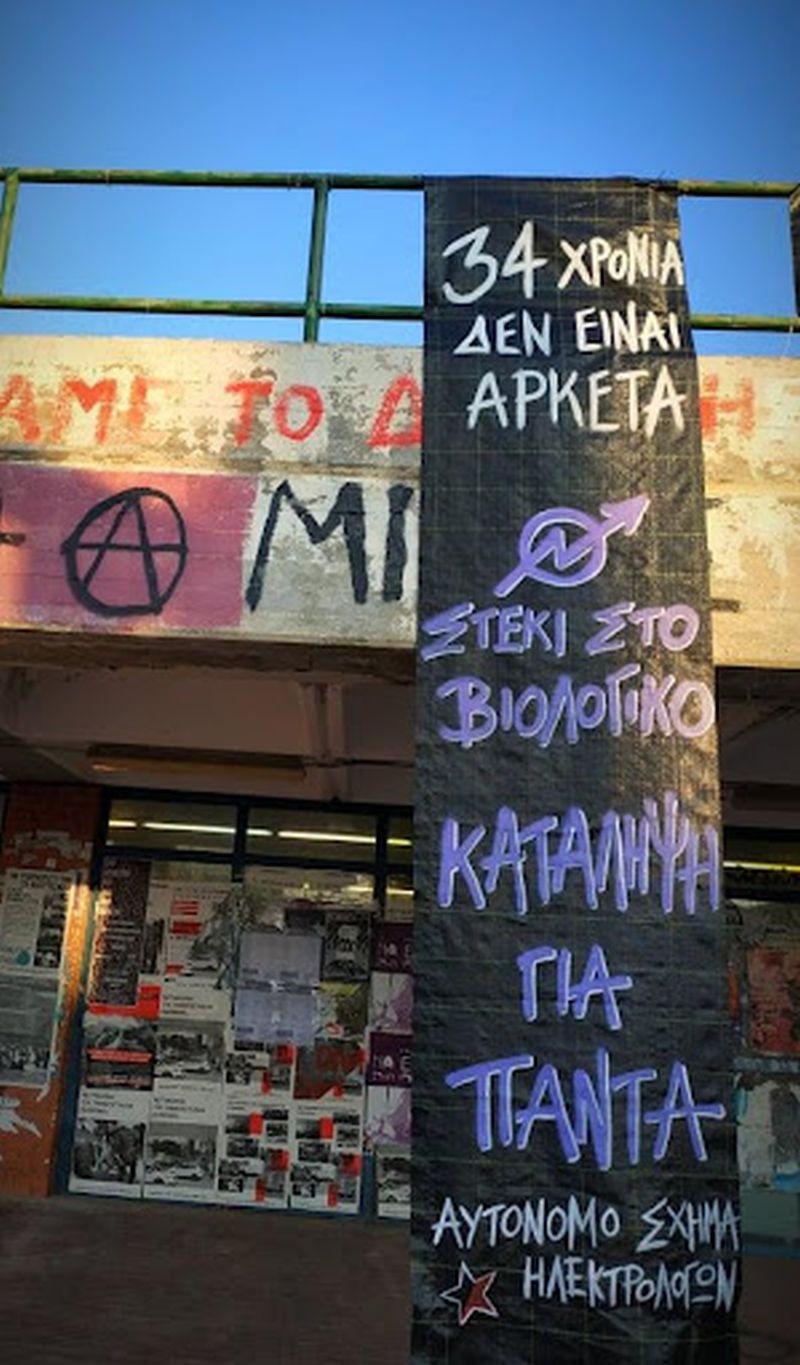During this period of 34 years, the steki has housed student, concert, theatrical, radio and political projects. Cafes, collective kitchens, screenings, Greek lessons for immigrants, self-defense lessons, etc. have been held there. There has been support for many struggles such as those against military conscription, support of political prisoners, and student squatting, and efforts have been made to provide financial support for court costs, the needs of four-legged companions, and medical expenses in solidarity. The steki to this day continues to be a meeting place and source of political ferment with the main axis of self-organization being anti-commodity, solidarity with incarcerated comrades and the daily claim of our lives.