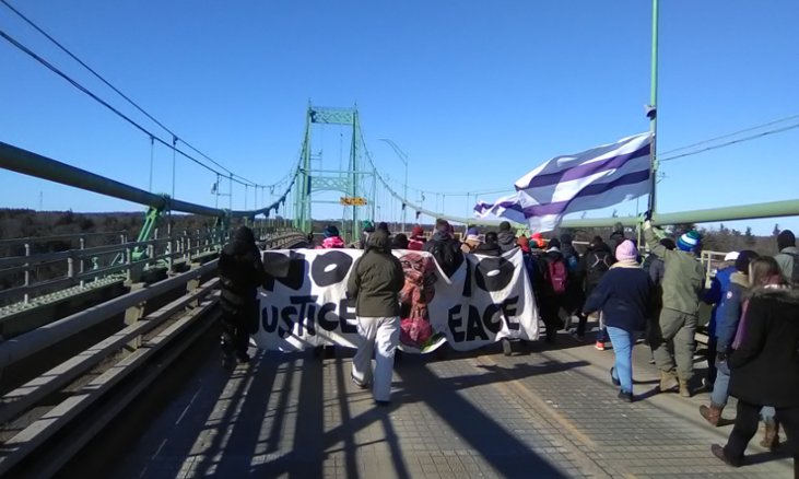 On Monday February 17th, 60 determined people occupied the Thousand Islands Bridge at the Canada/US border near Kingston for about 3 hours. We are a mix of indigenous and non-indigenous people responding to the call from Wet’suwet’en land defenders to rise up following violent RCMP raids to force a pipeline through their unceded territory. Our energy is particularly high thanks to the strength and resolve of the Mohawks at Tyendinaga who have forced the closure of Canada’s busiest rail corridor for 13 days now, creating a crisis for the federal government and an “emergency for the Canadian economy.” We were also excited to hear about the Rainbow Bridge occupation in Niagara Falls on Sunday.